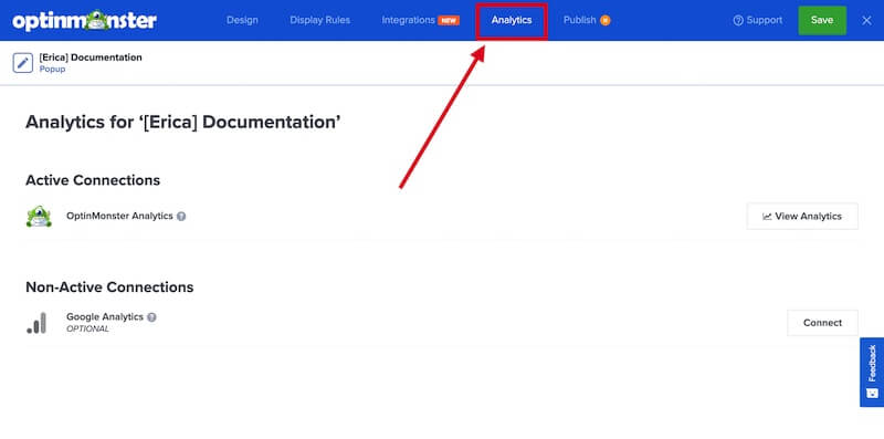 OptinMonster Analytics will automatically track basic analytics data (impressions, conversions, and highest-converting pages). You can also optionally connect your OptinMonster campaign to Google Analytics for more advanced reporting.